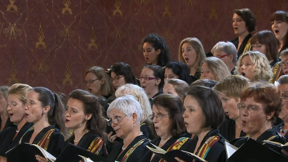First below is Brian Large's shot of the whole orchestra and chorus with the alter. It's maybe even prettier than the PR photo. In an ordinary hall, we would call this an "anthill" shot of little value as the orchestra fills only a small part of the view. But given the visual interest inherent in this venue, I counted every zoomed-out shot of the orchestra and choir as Other high-value in my video statistics discussed later.