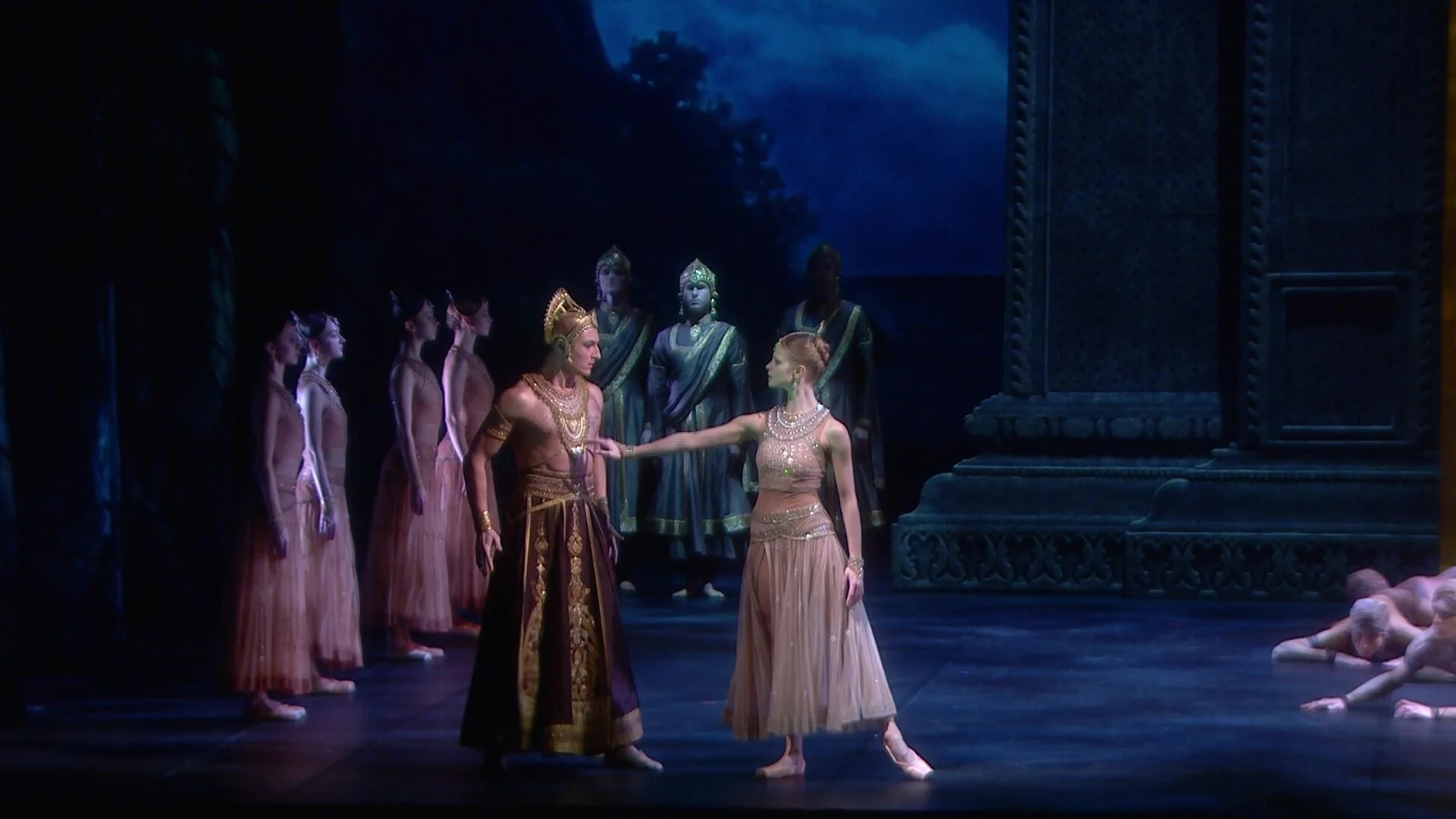 Solor pledges his love to Nikiya. Note in all these images so far how Sommers manages to get beautiful pictures of all the dancers even on the mostly dark stage. I suspect that Sommers has the very latest recording gear and got full cooperation also from the lighting crew: