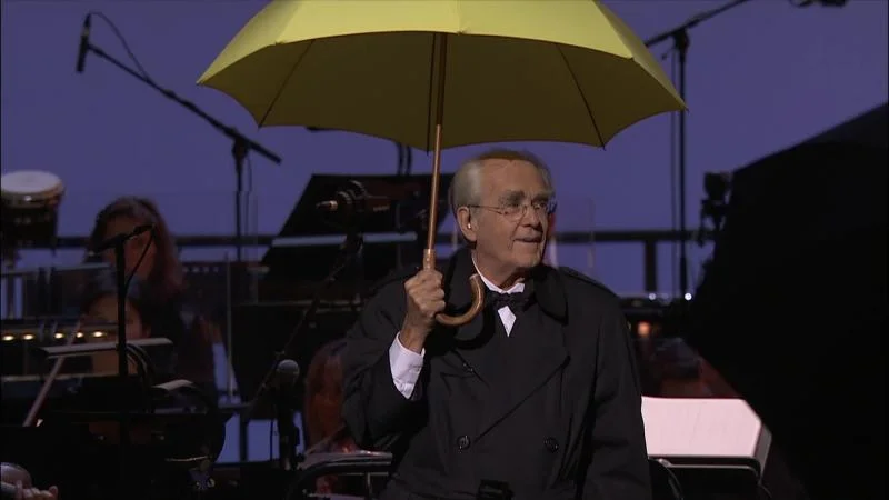Michel Legrand, age 82, pops out from behind an umbrella and then mounts the podium to conduct: